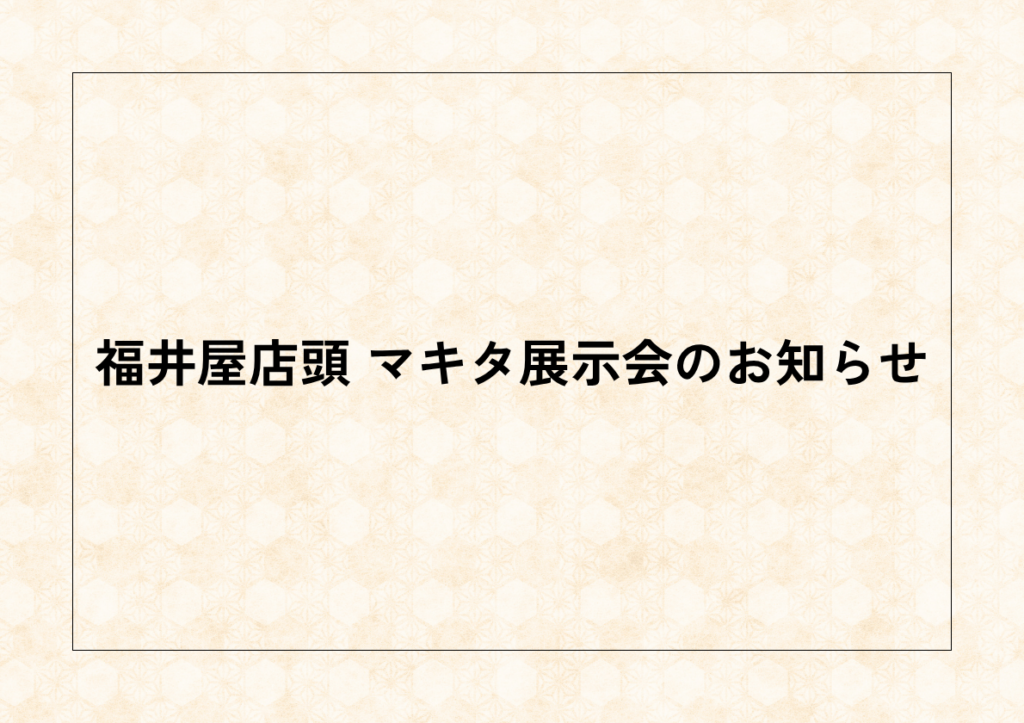 ホーム お知らせ 展示会 特価品 交通アクセス 福井屋店頭 マキタ展示会のお知らせ 日程:4月21日 (火曜日) 時間:15:00~19:00 福井屋店頭にて、マキタ展示会を行います。 皆様のご来店を心よりお待ちして […]